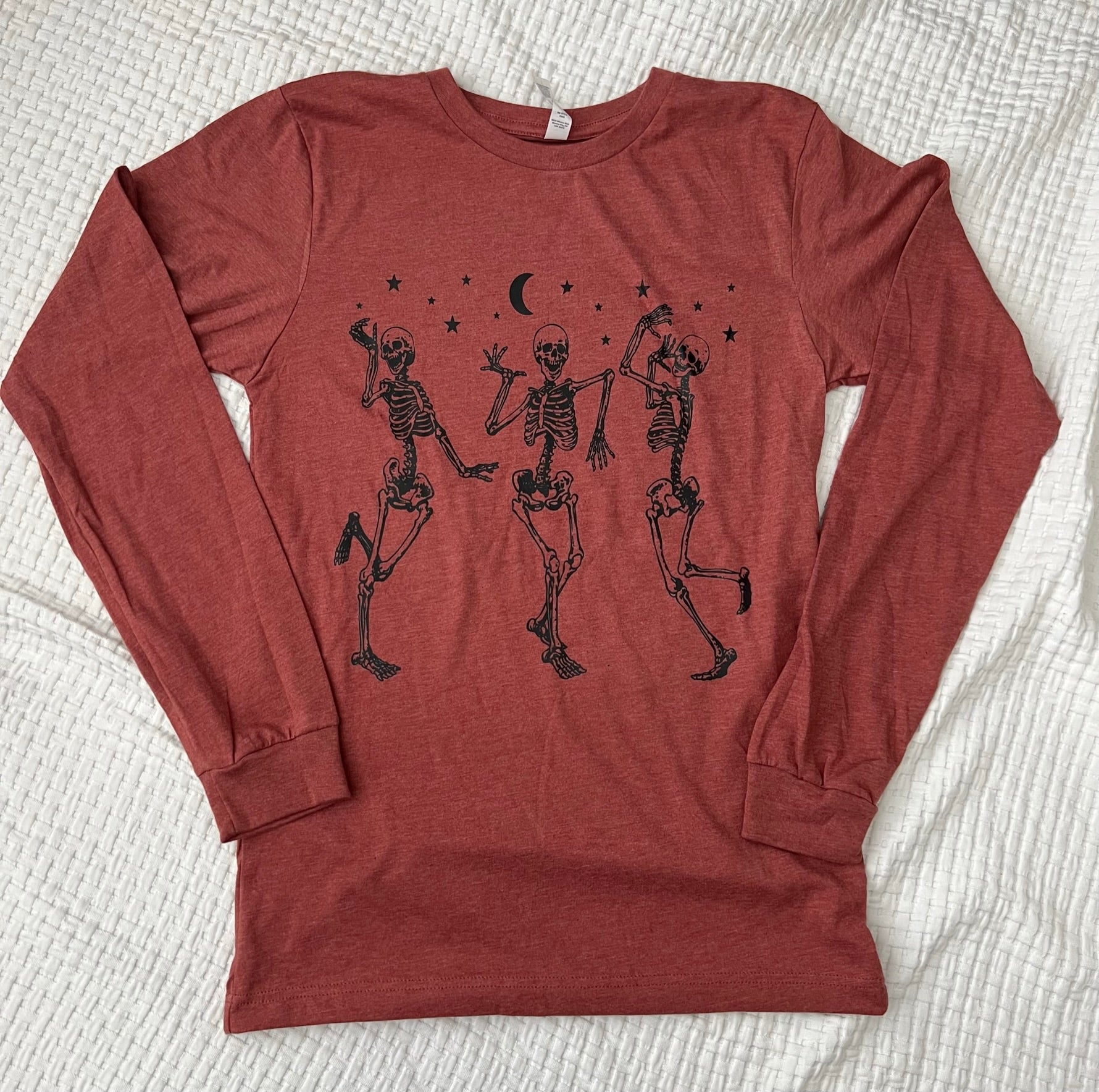 Bring some spooky fun to your wardrobe with the Dancing Skeletons Long Sleeve Shirt. Featuring lively skeletons in motion, this shirt adds a playful twist to your casual style. Perfect for those who love a bit of quirky charm, its comfortable fit keeps you dancing all day long.