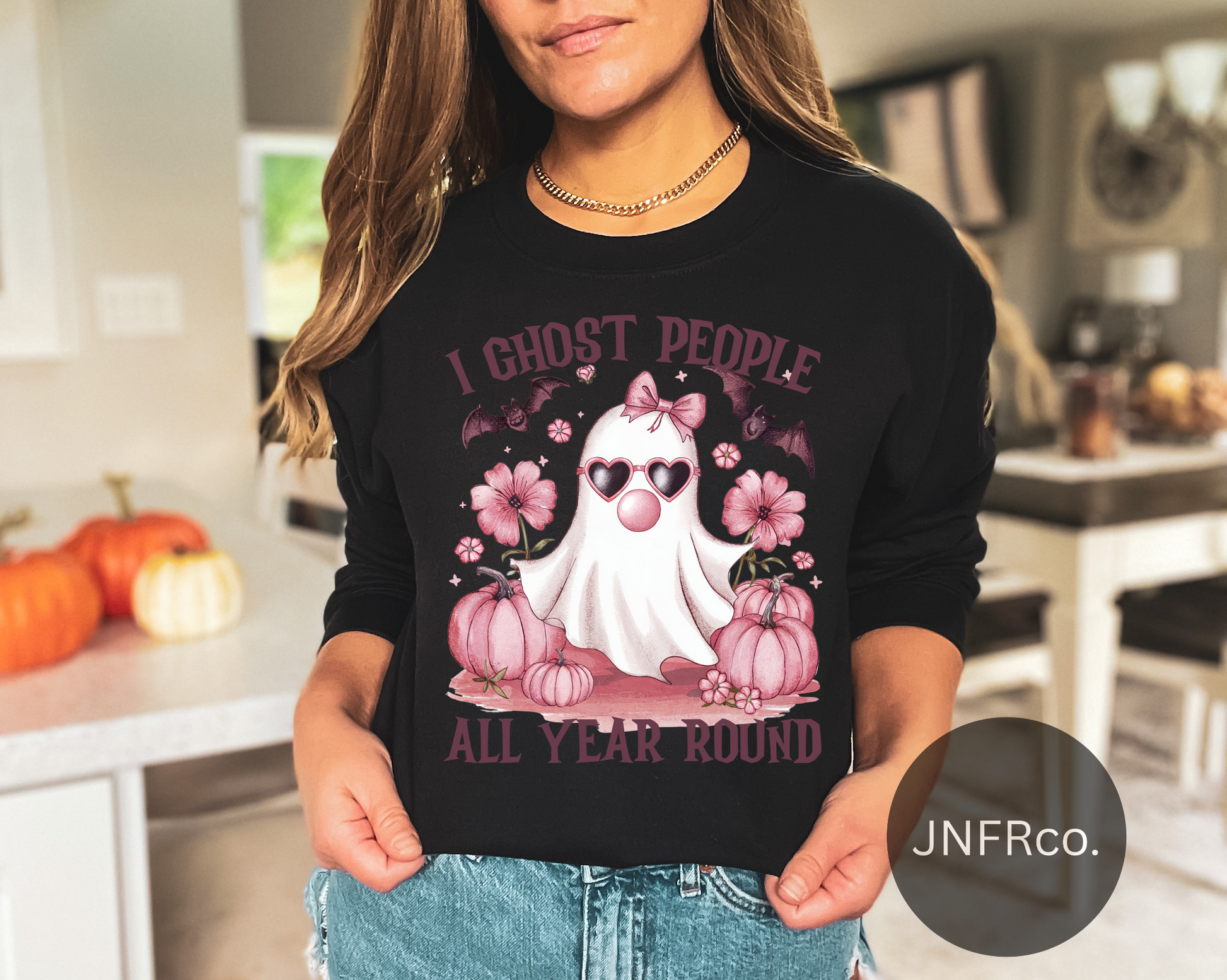 Stay spooky and sweet all year with the I Ghost People Pink Bubblegum Ghost Crewneck Sweatshirt. This cozy sweatshirt blends playful ghostly charm with a pop of bubblegum pink, perfect for adding fun to your casual look. Soft and comfy, it’s your go-to for chilly days when you want to haunt in style.