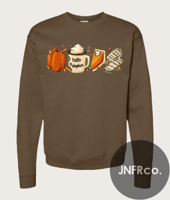 Cozy up in autumn vibes with the Pumpkin Coffee Pie Scarf Crewneck Sweatshirt! This playful sweatshirt blends the warm comfort of your favorite fall flavors into a snug, stylish look. Perfect for pumpkin spice lovers who want to wear their seasonal spirit with a smile. Whether you're sipping coffee or enjoying a crisp breeze, this sweatshirt wraps you in cozy fun all day long.